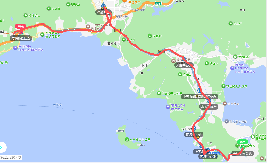 往新大公交总站方向:溪涌地铁站①(C出口)、葵涌中心、大鹏中心①、中国农科院深圳基因组所、水头海鲜街、南澳办事处、上下企沙、南澳月亮湾、新大公交总站