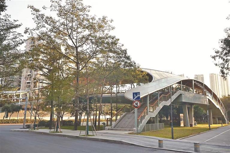月亮湾大道三号天桥全长约95.45米,主桥宽9.4米,梯道宽4米,东侧衔接南山荔湾社区居住区,西侧连通前海铁路公园商务区,其建成投用实现了居住区与商务区的顺畅联通。
