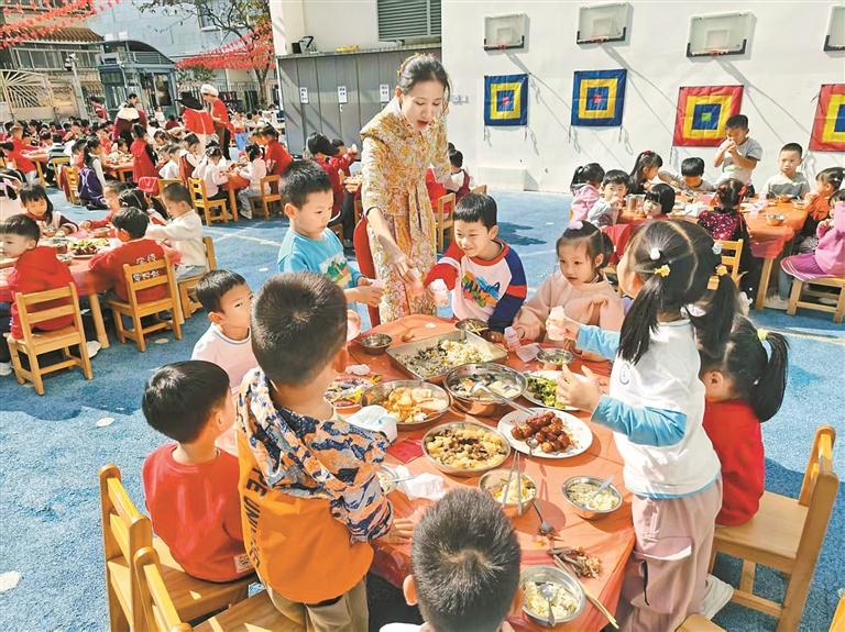 幼儿园特意为这场婚礼安排了“宴席”——将日常的月末自助餐改成热闹围餐,还为菜品起了满是好彩头的名字:清蒸龙利鱼化身“鸾凤呈祥鱼”;奥尔良烤翅变身“金翅报喜”;广式炒饭升级为“金穗喜盈饭”……20桌宴席满满当当,处处藏着童真和喜气。