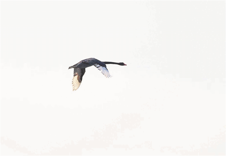 “快看!那是只啥鸟?”1月10日7时许,一只通身黑色却有着白色翼尖的大鸟突然出现在深圳湾上空,引起岸上人群的阵阵惊呼。几个刚刚支起单筒望远镜的小学生闻声望去,顿时被惊到目瞪口呆:“哇!哪里飞来的黑天鹅?”