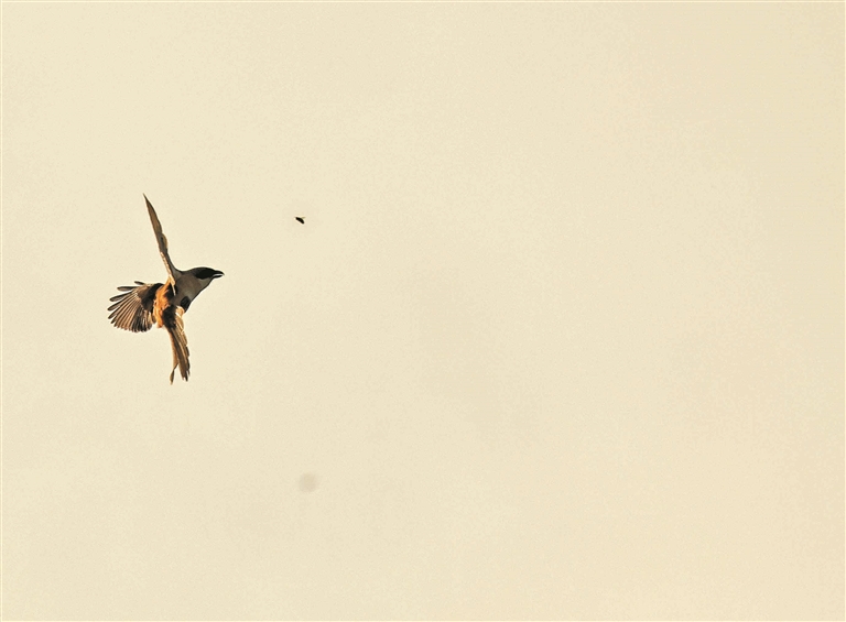 棕背伯劳飞扑猎物。
