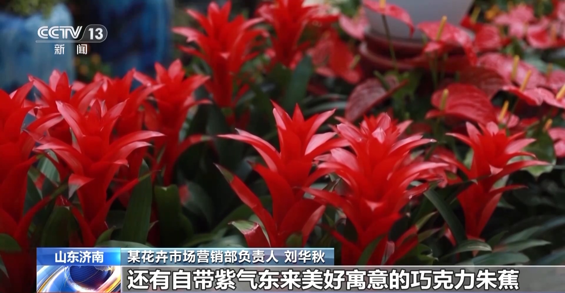 花卉市场营销部负责人 刘华秋:精心筹备了不少寓意美好的新颖品种,比如象征大吉大利的金橘、承载红运当头祝福的朱顶红,还有自带紫气东来美好寓意的巧克力朱蕉,每一款都蕴藏着我们的新春祝福。