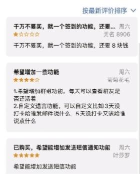 在社交网络上,“死了么”APP也引发了网友热议。有网友表示惊讶,“这不是原来的一个梗吗?居然真的做出来了”;有网友表示赞同,“独居的人确实有这方面的需求。”“爆火在于创意抓住了年轻人的痛点”;有网友质疑,“开发没花钱,全花在营销上了。”“没有任何技术门槛,周期都长久不了。”“刚开始1元,火了就变成了8元”;还有网友建议,“手机厂商完全可以跟进这个功能,每天只要解锁使用手机即可代替打卡。”“建议改名为‘还好吗’,既显关心又有距离”……