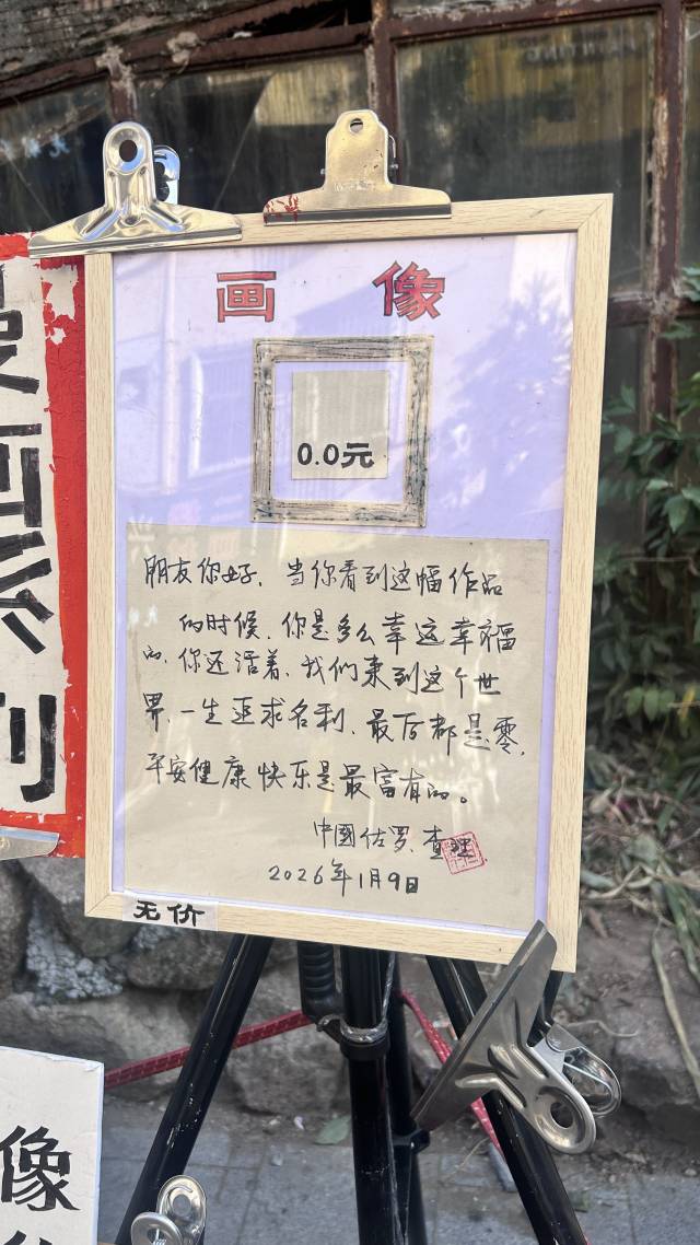 他的摊位边上,还贴着一幅标价“0.0元”的画,下面写着一行字: