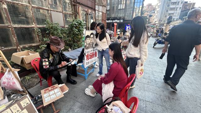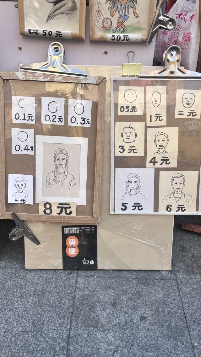 加到0.5元,寥寥数笔,一张人脸的神态就出来了。顾客还可以请摊主在旁边写上“勇气”“幸福”“快乐”“发财”之类的吉祥话。