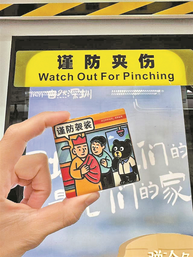 列车进出站台时的播报,则主要分两类:一是列车进站时的提醒,二是车门关闭时的提醒。此前,第二类提醒播报为“车门即将关闭,谨防夹伤”,这句略带“口音”的提示语被网友们幽默地玩梗为“谨防袈裟”,市场上还有以此为主题的文创作品大受欢迎。此次记者途经的多个站点,播报内容均为“车门即将关闭,请勿靠近车门”——“谨防袈裟”这句好玩的谐音梗,记者仅在9号线车公庙站听到了“原版”。每日地铁通勤的杨女士表示,以前没有到站播报时玩手机容易坐过站,现在加了到站播报,这个改变要给好评,“但‘谨防袈裟’没了,有点可惜,它已经成了深圳地铁的特色。”