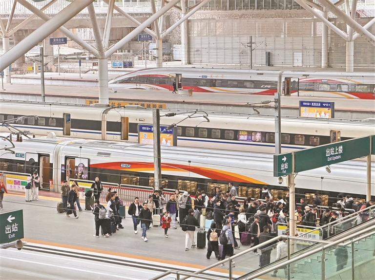 国铁各铁路局担当的所有过港列车升级为复兴号动车组,在速度、舒适度、智能化服务等方面全面提升,增强了长途高铁出行的吸引力,尤其对商务、旅游客流有显著促进作用。针对跨境客流增多,深圳北站、福田站力推“四通”服务:铁路通、深港通、粤语通、英语通,保障跨境旅客在购票、候车、换乘等各环节沟通无障碍。同时,进一步优化广深港高铁“灵活行”“计次票”服务的办理指引,通过清晰的标识和工作人员协助,帮助旅客实现便捷购票、改签,提升出行体验。