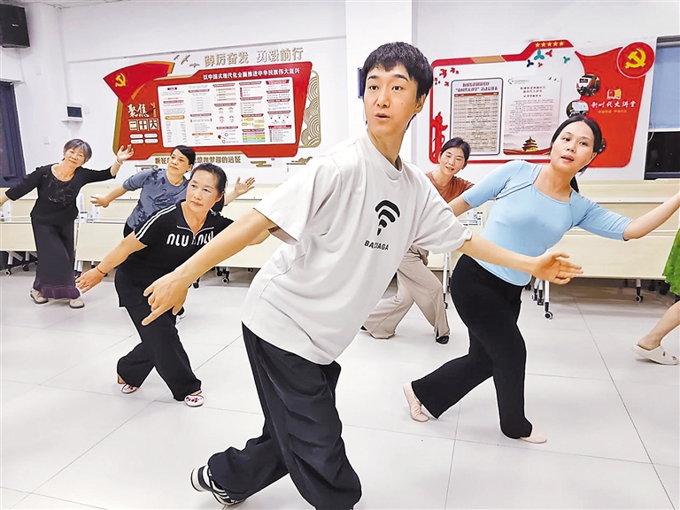 武强是专业舞蹈老师,一次偶然机会成为了社区公益舞蹈老师。学员几乎都是零基础,武强一个动作一个动作分解,一遍一遍带着练。谁紧张了、不好意思了,他还会开个小玩笑调节气氛。原本不熟悉的邻居,因为一起跳舞熟了,下课后还会聊聊家常;不少人被武强的热心感染,也主动报名当起了社区志愿者。今年,社区第一支志愿者舞蹈队——“律韵益动舞蹈队”正式成立,16名队员全是社区志愿者。如今,这支队伍已经好几次登上社区公益演出的舞台。