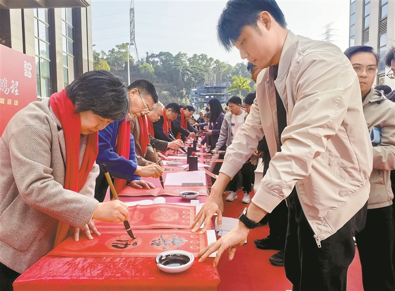 深圳新闻网2026年2月5日讯(深圳报业集团记者 刘钢)近日,位于龙华区大浪街道的深圳市国乐科技园里墨香袅袅,一场以“春联启鸿运,科技见鹏程”为主题的2026年迎新春书画名家送春联活动在此举行。该活动在大浪街道办事处的指导下,由深圳市书画家协会和深圳市国乐科技园联合主办,当天特邀18位书法名家现场挥毫泼墨,为园区企业和周边市民送上年味礼物。