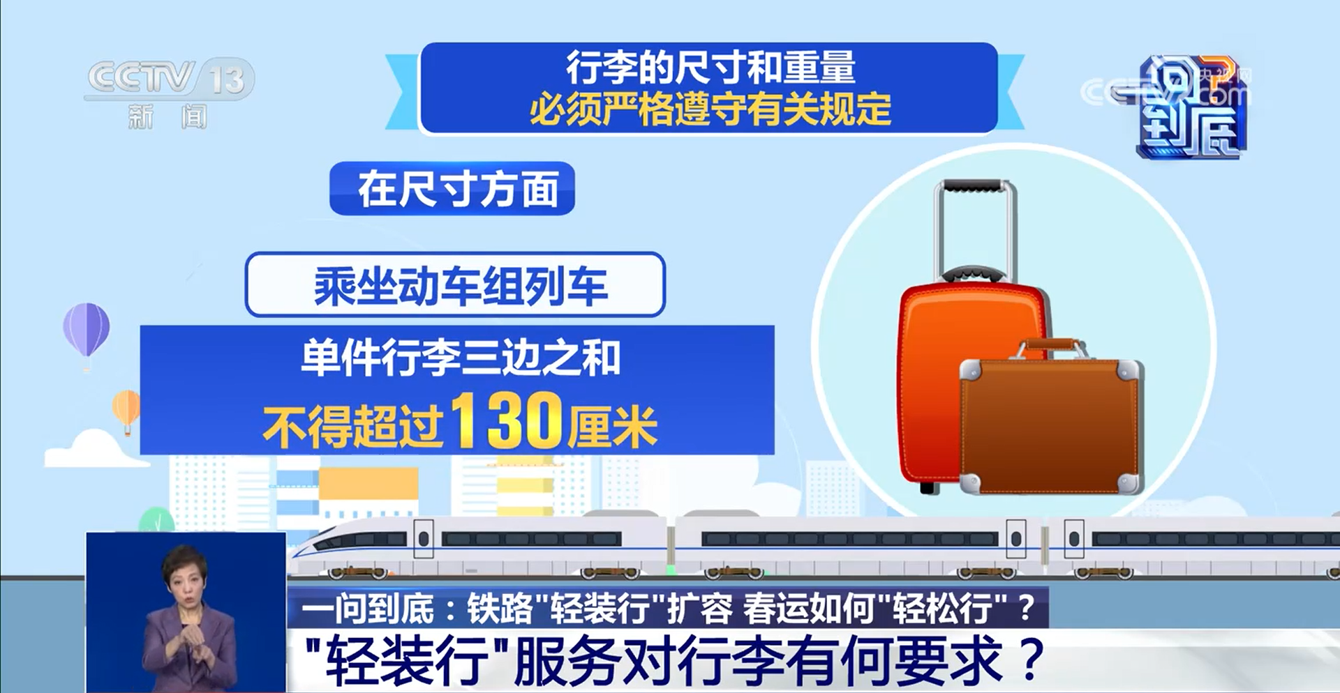 ·在尺寸方面:乘坐普速列车,单件行李的长、宽、高之和不得超过160厘米;乘坐动车组列车,单件行李三边之和不得超过130厘米。