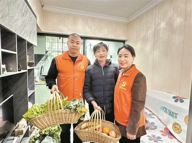 章阁社区党员志愿者提着新鲜蔬菜上门看望异乡姐弟。