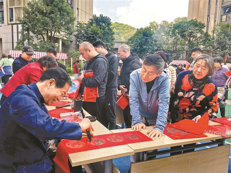 本月以来,各党群服务中心纷纷变身热闹的“年俗体验站”。书法志愿者现场挥毫,“马踏祥云送福联”活动已开展15场,送出春联福字超7000副,传统笔墨与AI互动区的融合,让祝福更添新意。10场红火的新春便民集市汇聚了手作体验、特色小吃和趣味游戏,让居民乐享年趣。公益全家福拍摄则为43户家庭定格了温馨的团圆时刻。特别的爱送给特别的人:77位志愿者上门为134户长者贴春联、做清洁;一杯杯“暖心姜茶”为565位户外劳动者驱散了冬日寒意。