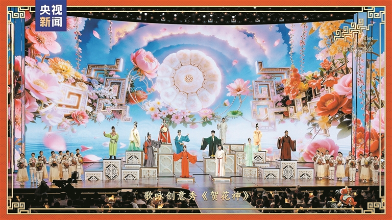 利亚德为歌咏创意秀《贺花神》营造出“人在景中、景随人动”的沉浸式意境。(央视截屏)