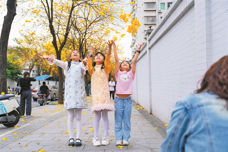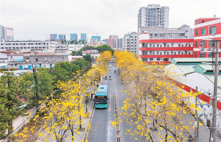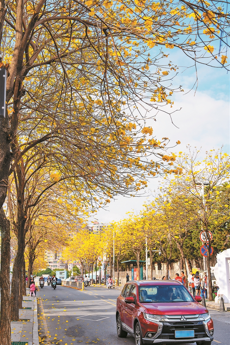 春风轻拂,暖意融融,城市里的黄花风铃木随春风前来报到。龙华大浪社区美宝路的百米黄花风铃木花廊,也迎来最美盛景,微风拂过,金黄花瓣簌簌飘落,宛若下起浪漫“黄金雨”,成为居民家门口的赏花胜地。