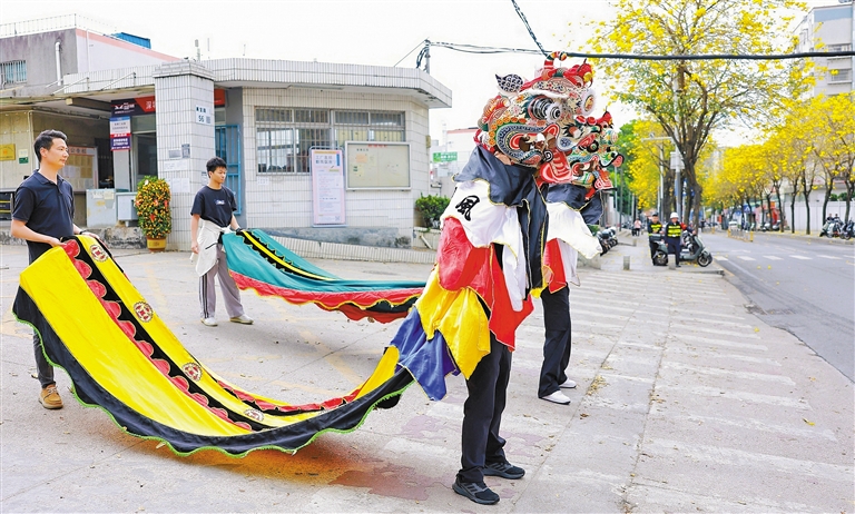 漫步花廊,满目金黄沁人心脾,微风掠过,落花铺就金色地毯,居民们或拾起花瓣别在耳边作天然头饰,或用落花摆成心形定格美好,春日的雅致与欢喜在镜头里静静流淌。社区早已贴心布置好打卡景观,马年元素与福字纹样相映成趣,异形手持牌、吉祥福串等免费道具一应俱全,让每个人都能轻松留住春日瞬间。作为辖区名片,非遗舞麒麟也为这场春日之约添上了浓墨重彩的一笔。春花灿烂,麒麟舞动,在赏春观景的同时,也提供了一次沉浸式触摸本土非物质文化遗产深厚底蕴的机会。