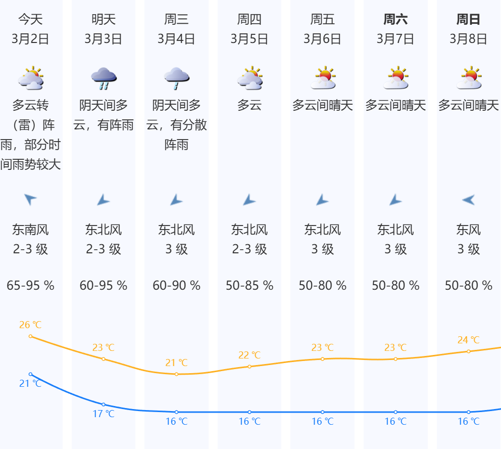 3月2日,深圳多云转(雷)阵雨,部分时间雨势较大;气温21-26℃;东南风2-3级;相对湿度65%-95%。