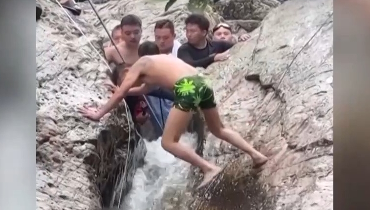 男孩溯溪被卡河道石缝 游客组成人墙合力救下