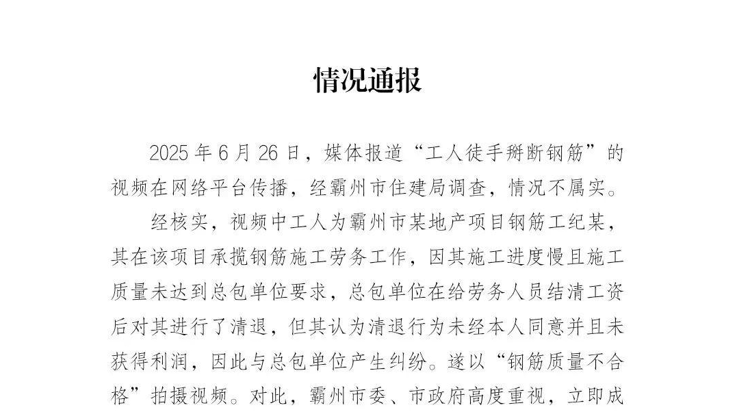 工人徒手掰断钢筋?河北霸州:情况不属实