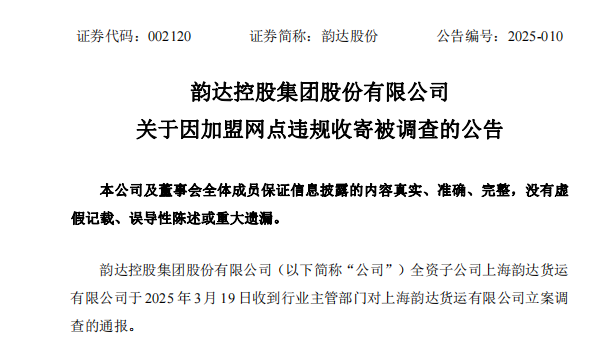韵达回应被立案调查:成立专班内部调查,立即部署整改