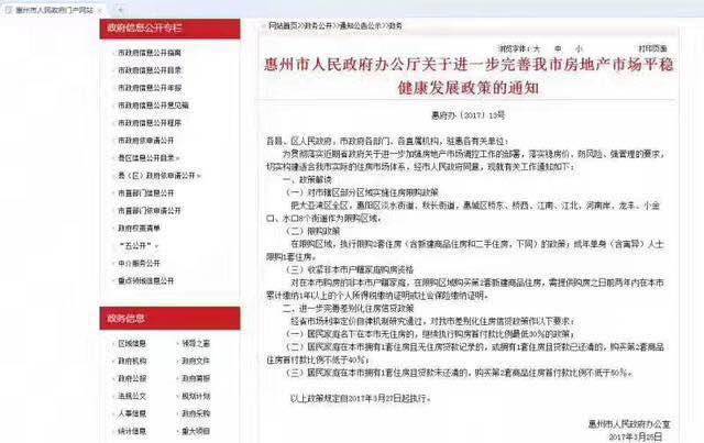 3月27日凌晨,一张名为《惠州市人民政府办公厅关于进一步完善我市房地产市场平稳健康发展政策的通知》的截图在网友间传播,其落款为“3月26日”,内容则包括“限购”“信贷”等所谓的最新政策。但记者随后多方证实这张截图为假的,惠州市相关部门已请网警部门介入调查,核查该假图片的出处。
