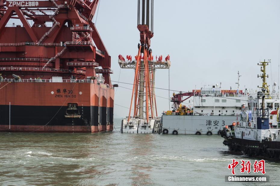 与其他沉管管节不同,最终接头构件采用“三明治”钢壳混凝土结构,整体呈楔形,高11.4米,底板长9.6米,重达6000吨。这样一个“大家伙”入水后还要受洋流、浮力等影响,姿态会发生变化。为了保证吊装完成后顺利止水,高低差控制在15mm以内。并且必须一次成功。中新社记者 陈骥旻 摄
