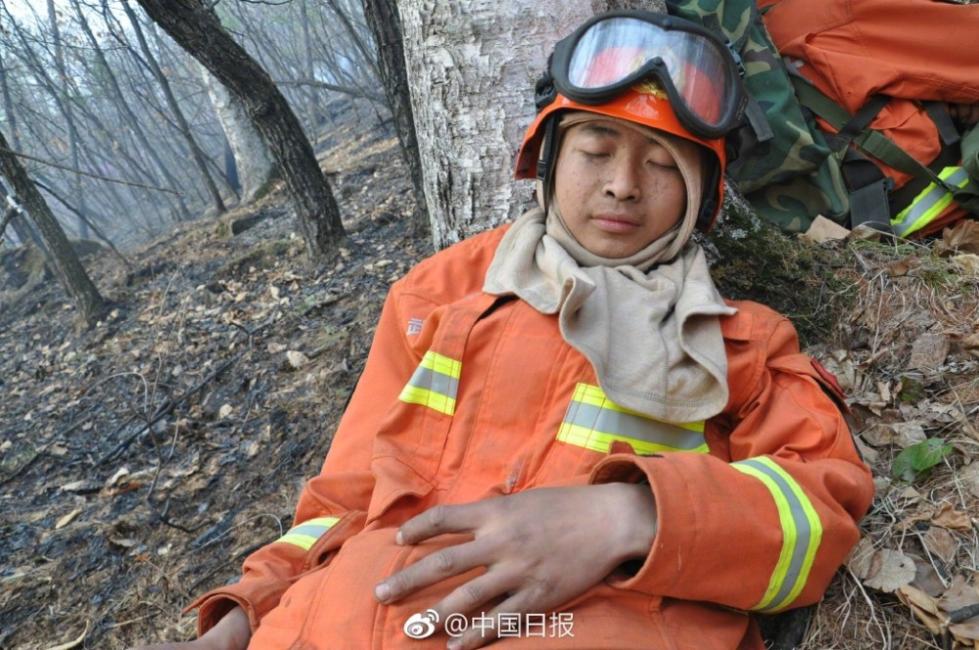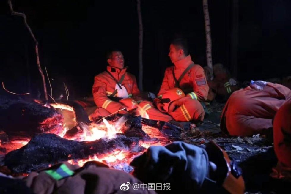 据了解,此次森林火灾过火总面积达1万公顷左右,已调动各方扑火力量近9千人次。起火原因系当地管护站司炉工倾倒燃烧残渣剩余物引发。图为消防战士们在林中休息。
