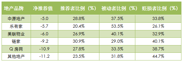 ■ 中原地产:总体净推荐率第一,在品牌推广方面排名较好,费用方面排名最后;