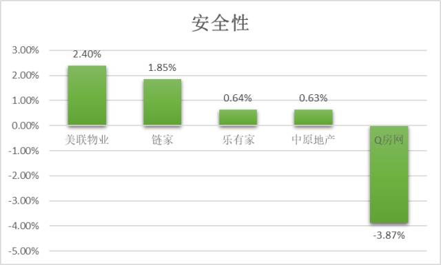 美联物业在安全性方面净推荐率最高,为2.4%;而链家也在其之后为1.85%,受到了顾客的肯定;Q房网的安全性净推荐率最低,仅为-3.87%。