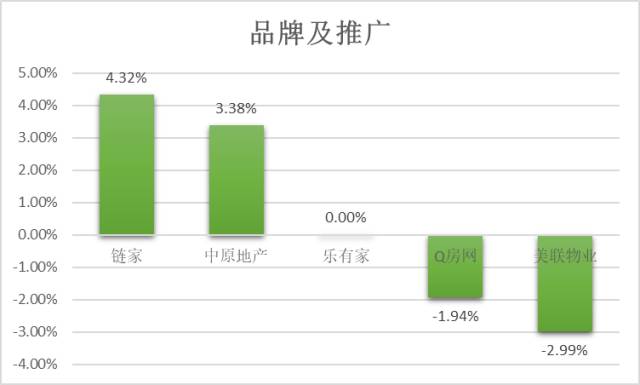 链家在品牌推广方面,相对于其他地产中介,净推荐率最高,超过4.0%。各品牌之间差距较大。