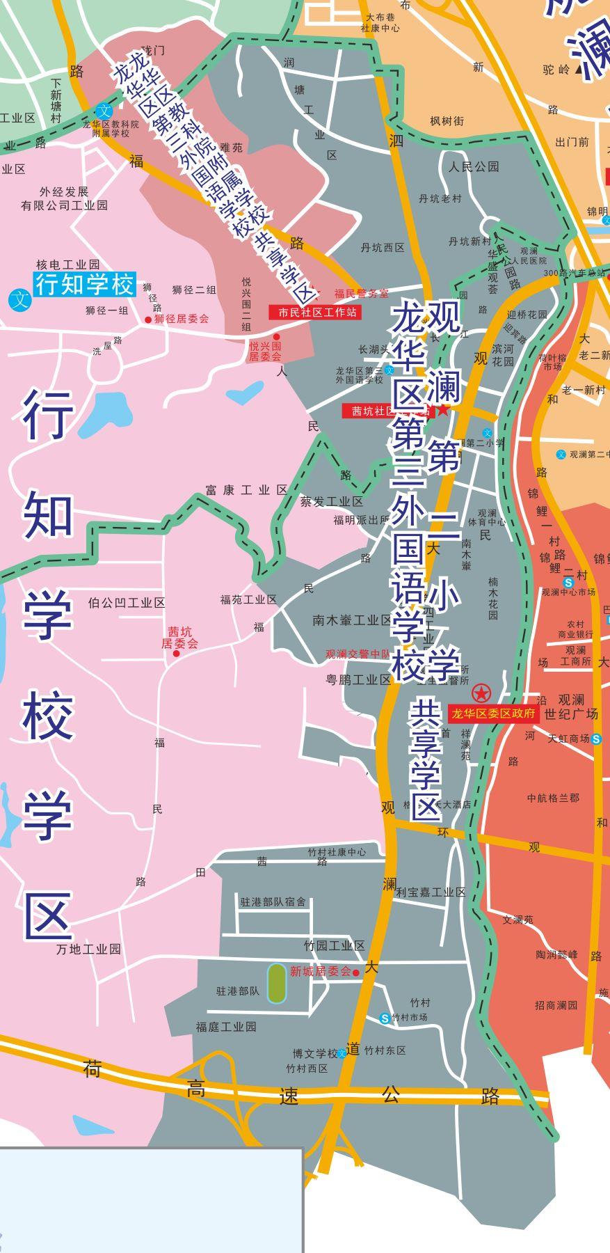 1.龙华区第三外国语学校小学部与观澜第二小学及龙华区教科院附属学校小学部共享学区范围;丹湖居委会、新城居委会、四和居委会的适龄儿童可选择申请龙华区第三外国语学校小学部、观澜第二小学其中一所学校学位;福安居委会、悦兴围居委会、珑门的适龄儿童可选择申请龙华区第三外国语学校、龙华区教科院附属学校小学部其中一所学校学位。
