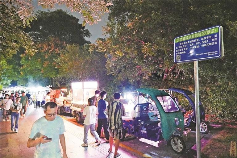 经过大半个月的试点磨合,再加上国庆黄金周假期的实际考验,这场治理行动的成效究竟如何?10月10日晚,记者现场走访福城街道宝源科技园疏导区以及民治街道红山地铁站D出口疏导区,眼前的景象令人耳目一新:昔日里,流动摊贩为躲避监管四处“打游击”,占道经营现象频发,常常造成交通阻塞的“拥堵点”,如今在精细化治理措施的推进下,已蜕变为摊位规整、经营有序的“便民区”。“市井烟火”与“公共秩序”在治理实践中,找到了难得的平衡点。