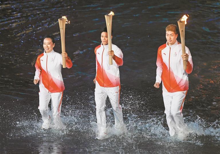 火炬手苏炳添(中)、张家朗(右)、李祎在开幕式现场跑向主火炬。