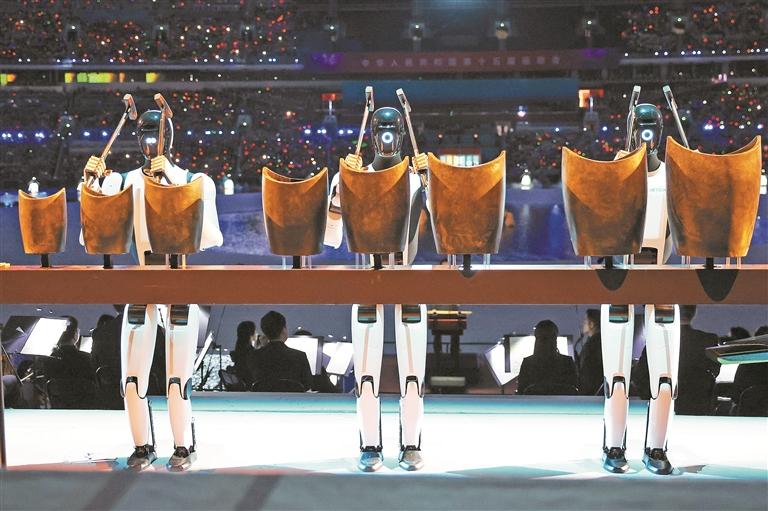 十五运会开幕式上,岭南名曲《彩云追月》响起,人形机器人站在交响乐团最后一排,敲击着千年前的中国古代乐器——青铜句鑃。