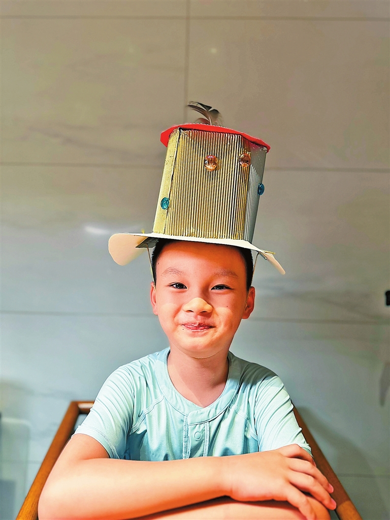 薛楚衡用废纸箱制作的帽子。 深圳晚报记者 王宇 实习生 叶婧菁 摄