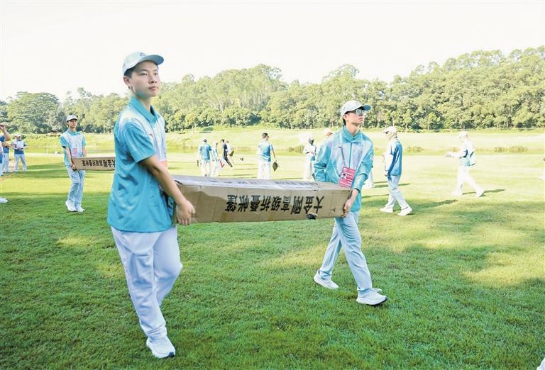 “小海豚”志愿者在观澜湖黎光会所赛场参与场地布置工作。