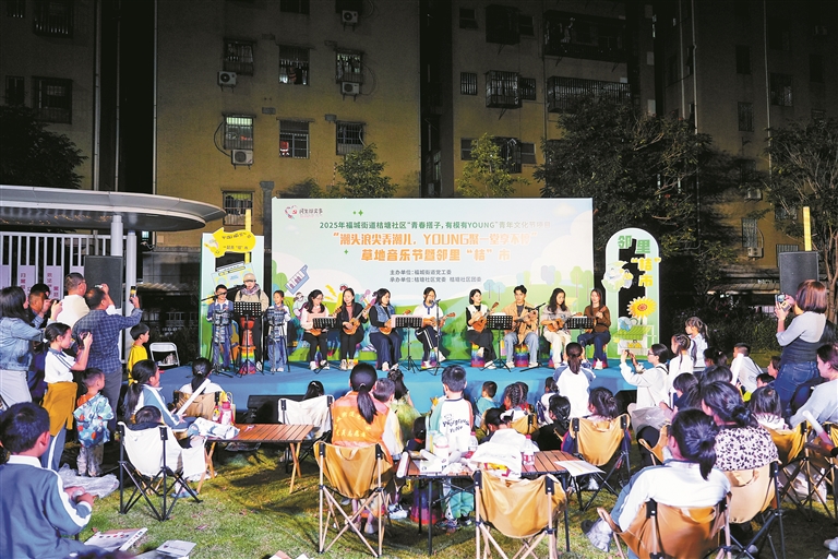 龙华新闻讯(记者 黄晓华 通讯员 姚广燕/文 记者 陈建华/图)近日,福城街道桔塘社区在福园街心公园开展草地音乐节暨邻里“桔”市活动。活动以星空为幕、草地为席,围绕“全龄友好、多元共融”主线,融合非遗体验、音乐演出、互动市集与运动公益等元素,为老、中、青、少四代居民打造一场精彩纷呈的文化盛宴。