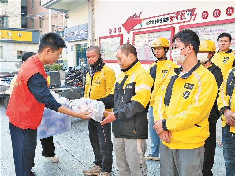大水坑社区党委为骑手们送上“暖冬三件套”。