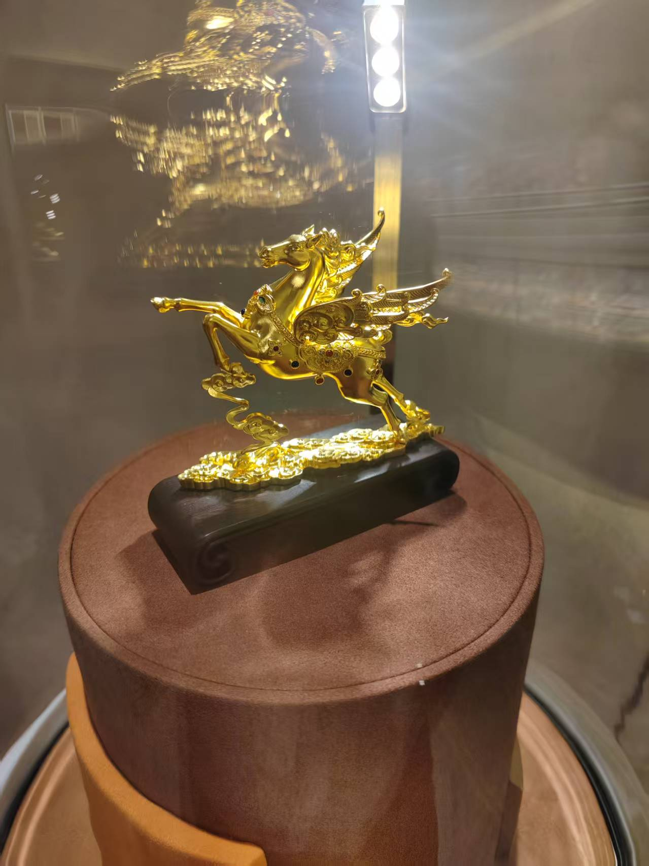 1月15日,记者走进水贝金座、水贝壹号和水贝国际中心,在负一层的各大金饰柜台前,一眼就能看到各式各样的马年主题新黄金。从寓意“马到成功”的大型摆件,到造型别致的生肖马吊坠及文创产品,不同风格的金饰在灯光下闪闪发亮。