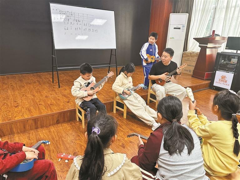 大水坑社区的孩子们跟随老师学习尤克里里。